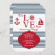 A spirited, nautical, anniversary invitation for lovers and sailors. The white background features blue stripes and red nautical motifs. The word love has a helm in the place of the letter "o". (FP)