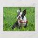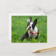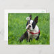 This fun canine postcard features an image of a black and white Boston Terrier puppy dog with a tall dandelion with a green grass background.