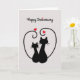 A sweet anniversary greeting with two black cats with long tails forming a heart, accented with two red hearts on a gray and white polka dot background. The letter "i" in anniversary is dotted with a red heart.