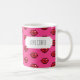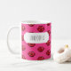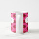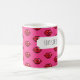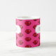 A mug for a coffee lover featuring a simple red lips or kisses icon, in a blocky pixel art style, arranged in a half drop repeat pattern on a pink background. Use "Personalize this template" to change the "LOVE COFFEE" text if desired. A fun or romantic gift in the style of old games and retro 8 bit style images; an interesting alternative on a classic symbol of love or romance.
