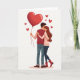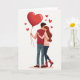 This greeting card shows a young couple hugging close against an off-white background. The man faces away from us in a red vest over a light shirt and blue jeans, and he holds a string attached to a large red heart balloon floating in the upper left. The woman rests her head on his shoulder with her eyes closed, looking calm and safe, and her auburn hair falls down her back. She wears a pale pink sweater, dark pants, and red boots, and her arms wrap around his waist with her hands resting on his back. Small red hearts drift near the upper right, adding a sweet touch that matches the big balloon. There isn’t any printed message or lettering visible on the front of the card—just the illustration doing the talking ❤️💌. It feels like a quiet moment of love and comfort, perfect for someone special, and it even hints at sharing a little treat like 🍫. Wishing you a happy Valentine’s Day