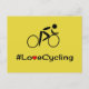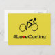 Don't just like cycling: #LoveCycling! A postcard for anyone who enjoys cycling. Simple text in black with a red heart, and a pictogram cyclist above, on a yellow jersey colored background.