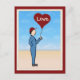 A cheerful, simply-drawn deliveryman in blue coveralls and a red cap brings the gift of love in the form of a big, red, heart-shaped balloon on this postcard. He stands on an open plain in front of a blue sky full of clouds. The customizable text on the heart can easily be changed to say whatever you like. From my original digitally created mixed media image.