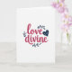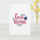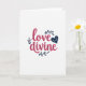 This greeting card centers the words “love divine” in bright fuchsia, placed right in the middle of a white background. The letters look hand-drawn and rounded, with each stroke filled with tiny patterns like little hearts, stars, and small flower shapes in pink, blue, and soft gold. In the top left and bottom right corners, deep navy leaf sprigs curve inward like gentle frames. Near the upper right, there’s a solid navy heart with a single white leafy branch inside it, adding a quiet, caring touch. The mix of fuchsia and navy feels romantic without being too much, and the white space keeps the focus on the message ❤️. It’s the kind of card that works for a partner or a close friend, because it says something sweet while still feeling simple and sincere 🥰. Share it to help pass along your Valentine’s Day feelings in a warm, honest way.