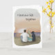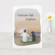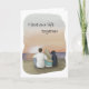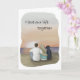 Beautiful, romantic greeting card featuring a couple with a dog sitting on a beach and watching a sunset.