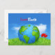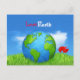 Beautiful Earth Day Celebration postcard featuring planet earth illustration on green grass with red flower and sky with cloud in the background