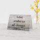 Quote from scripture from First Corinthians on love and endurance. Photo background is a distressed wooden table. Small cracks and grooves in the wood, in color variation of light grays and browns. The image evokes seriousness and authenticity to any message such as sympathy on loss of a loved one. Blank inside for your own message.
