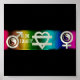 A textured rainbow background with the male and female signs, which include the ying-yang in the center of the signs. In the center of this design is a heart with the equal sign. In a white font is the text, Love Equality.