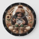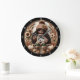 This charming autumn-themed clock features an adorable doll with long dark braids, wearing a knitted hat with a pom-pom, a cozy sweater, and boots. She holds a sign that says "LOVE FALL". Sunflowers, wheat, and pumpkins surround her. The clock has a black border with white numbers 1-12.