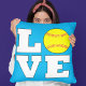 A super cute and customizable throw pillow for fastpitch softball players and fans, with LOVE printed in bold white text and a fastpitch softball graphic in place of the O. You can the leave the background color as is, or click [Customize] and use the color picker tool to select any background color you want. Makes an awesome bedroom decoration for softball lovers!