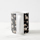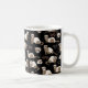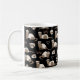 Hand-drawn ferrets, xoxo and hearts pattern coffee mug, black background.