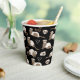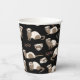 Hand-drawn ferrets, xoxo and hearts pattern paper cups, black background.