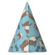 Hand-drawn ferrets, xoxo and hearts pattern paper party hats, blue background.