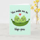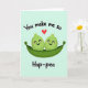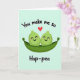 This greeting card shows two round, green pea-like characters snuggled together inside an open green pod, their curved smiles and pink cheek blushes suggesting a sweet, close bond ❤️. Their small, dark half-moon eyes face forward, giving them a calm, content look as they sit tucked into the pod like a cozy cradle. A single red heart floats above them, centered and hovering like a quiet sign of affection. The background is a soft pastel aqua that keeps the scene light and airy while making the greens and red stand out. Near the top, the words “You make me so” arc gently above the characters in dark lettering. Near the bottom, “Hap-pea” appears as the punchline in matching dark text, spaced to sit neatly beneath the pod. The illustration uses smooth, rounded shapes and simple shading, letting the pair’s closeness do the talking 🌼. The pod curves upward at both ends, with the two green characters nestled side-by-side under the centered red heart.