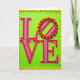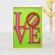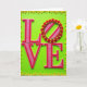 This greeting card centers on the word “LOVE” in big, raised-looking letters on a bright lime green background. The L, V, and E are filled with a red-and-white gingham check pattern and outlined in red, giving them a cozy, homey feel. The O is a flower wreath made of red daisy-like blooms with small yellow berry dots and a few green leaves tucked in. A border of small yellow daisies with orange-brown centers frames the whole front like a cheerful picture frame. The lighting adds soft shadows that make the letters and flowers look more three-dimensional. The word “LOVE” sits right in the middle, and the lettering looks like chunky, 3D print with clear edges that stand out against the green. It feels meaningful to give because it’s simple, bright, and full of care—perfect for saying “I’m thinking of you” 🥰❤️.