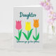 This greeting card features the word “Daughter” centered near the top in flowing teal lettering against a soft light gray background. Below it, three stylized flowers sit side by side like a small garden panel, their simple outlines and solid fills giving them a modern, tidy look. The left bloom is bright pink, the middle is sunny yellow, and the right is warm orange, each rising from slim green stems with curved leaves that lean toward one another like close friends 🌷. Near the bottom, a matching teal line of text reads, “Wherever you go, love follows,” set neatly beneath the flowers and aligned to feel balanced with the title above. The spacing between the top word, the flower trio, and the lower message creates a calm rhythm, like a gentle conversation across the page. A few subtle tonal shifts inside the petals add a soft sense of depth without heavy shading, keeping the focus on the affectionate, steady look of the arrangement 🐰. The three blooms are evenly spaced in a horizontal row, with bright green stems and arcing leaves that mirror each other against the pale gray backdrop.