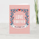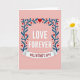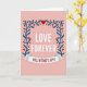 This Valentine’s Day card shares a message of lasting love through graceful details and warm color tones. The background is a soft light pink that highlights the bold white lettering reading “LOVE FOREVER” at the center. Surrounding the message is a flowing botanical design in deep teal-blue, with elegant branches and leaves decorated with small red hearts. These hearts lead upward to a larger red heart at the top, symbolizing deep connection and devotion. Beneath the main message, a white ribbon curves gently across the card, displaying “VALENTINE’S DAY” in rich red letters that echo the hearts above. The thoughtful layout and gentle contrast create a heartfelt card perfect for expressing love and affection. ❤️