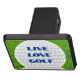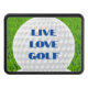 This sporty hitch cover features a photograph of a golf ball and the text "Live love golf" Buy as shown or personalize with your own words and font color