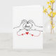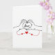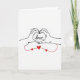 This card shows two simple black-outlined hands reaching toward each other and touching at the fingertips to form the shape of a heart. Inside that heart shape, the word “love” appears in a smooth, flowing black letter style, centered between the fingers. The background is plain white, so your eyes go straight to the hands and the message. Near the bottom, a red thread runs across the card in a gentle wave, like a line connecting moments together. Three textured red hearts sit along that thread, with one larger heart in the middle and two smaller ones on either side. The hands and the red hearts together feel like a quiet promise of care, making it meaningful for a partner or a close friend 🥰❤️. It’s an easy way to share Valentine’s Day sentiments with someone you care about.