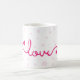 Featuring a delicate, wraparound pattern of soft pastel hearts, this mug brings a touch of whimsy to your cupboard. The focal point is a beautiful, vibrant magenta "Love" script in a flowing, modern calligraphy style that connects effortlessly around the base. It’s a gentle reminder to enjoy the moment, whether you’re starting a busy workday or curling up on a Sunday morning.
