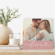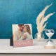 A romantic dusty rose plaque sign featuring "Love" in delicate white calligraphy script with a heart flourish, layered over a single custom photo. The soft rose pink color band adds a feminine, romantic accent beneath the image. The photo is fully customizable — a gorgeous keepsake for couples, an anniversary gift, or a Valentine's Day display.