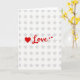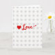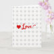 This greeting card features a simple white background patterned with a neat grid of soft gray, asterisk-like shapes that add gentle texture without stealing attention. Near the center, a solid red heart sits just to the left of the main word, setting up a sweet, close-to-the-chest feeling 🥰. The text reads “Love” in flowing red lettering, placed prominently across the middle so it feels like it’s being said out loud. The red color is rich and warm, like a blush on someone’s cheeks when they see a favorite person ❤️. Trailing the word are two tiny red accents—a small star and a little heart—like a lingering glance that doesn’t want the moment to end. The overall layout is airy and bright, with even lighting that keeps the white space fresh while making the red details stand out. The final touch is the tiny red star and mini heart floating just after the last letter, hovering over the pale gray pattern.