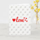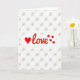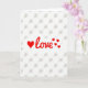 This card features a large red heart followed by the word “love” in flowing red lettering, creating a sweet focal point that feels like a warm confession ❤️. To the right of the word, three smaller red hearts trail outward like a little flutter in the air, adding a light, affectionate rhythm 🥰. Everything sits on a bright white background that makes the red stand out sharply and keeps the look airy. Behind the main design, a faint taupe pattern forms a soft grid of tiny tie-like shapes, like miniature ribbon knots repeating across the page. The main text is centered and sits around the middle of the front, with the heart acting as the first “character” in the message. The smaller hearts are placed just beyond the last letter, as if the word is sending them drifting away. The subtle taupe shapes stay low-contrast and evenly spaced, giving the white space a gentle texture without competing with the red. The final detail is the barely-there taupe grid that runs edge to edge behind the red heart and lettering.