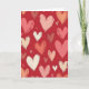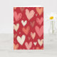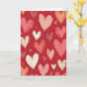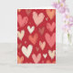 This greeting card shows a deep red background filled with hearts scattered all over, with no single main heart in the center. The hearts come in different sizes and angles, and they’re colored in soft pink, peach, off-white, and darker rose tones. Each heart has visible brush marks, so they look painted and a little different from one another in a sweet, natural way. Between the larger hearts, there are tiny “v” marks that look like small accents floating in the open spaces. The overall feel is warm and romantic, like a page covered in little reminders of care and closeness 💕❤️. There isn’t any text shown on the card, so the heart pattern is the full message on its own.
