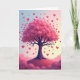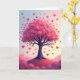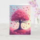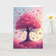 This design shows a large, stylized tree in the center of the card, with a thick purple trunk and branches reaching up like open arms. The tree’s top is full of cotton-candy pink leaves, sitting on a rolling hill in deep fuchsia. Dozens of puffy heart shapes, in an even brighter pink, float up from the tree and drift across the sky like little love notes 💘. The background sky fades from soft blue on the upper left to a warm yellow-pink glow on the right, like an early morning or evening light. Along the bottom, soft pink cloud shapes fill the foreground and make the whole scene feel gentle and dreamy ❤️. There isn’t any text shown on the card, so the artwork is the main focus and sets the mood on its own. It’s a sweet choice for letting someone know you care on Valentine’s Day 😘.