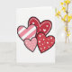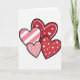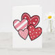 This Valentine's Day card shows four hearts grouped close together and slightly overlapping on a plain white background. One heart has pale pink and white candy-cane stripes, and another large deep red heart is filled with tiny white hearts and a thin white line inside it. A smaller blush pink heart has little white symbols and marks scattered across it, almost like a secret note, and a second deep red heart also has small white hearts sprinkled over it. All the hearts have a thick black outline that makes the shapes stand out clearly. There isn’t any printed message or lettering on the front, so the design does all the talking. The overall look feels sweet and affectionate, like a box of treats you’d share with someone special ❤️💌🍫.