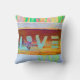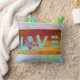 Love hippie bohemian boho pillow. Bright green, pink, yellow rust, copper colors. Word 'LOVE' painted on wood. Go out in style with this colorful pillow. Cool, trendy, modern, chic home decor.