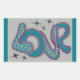 Handwritten bold letters, hearts and stars. On some products you can play with background color.