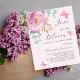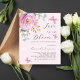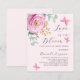 A soft blush pink background. Decorated with a pink rose and green watercolored eucalyptus greenery and butterflies. Personalize and add your name and party details. Text: Love is in Bloom.