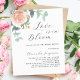 A chic white background. Decorated with a rose gold and blush pink floral, rose flower and green watercolored eucalyptus leaves, sprigs, greenery and a faux gold sprig. Personalize and add the name of the bride to be and party details. Text: Love is in bloom.