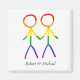 This magnet features a sweet and heartfelt design perfect for celebrating a wedding. The graphic depicts two men, in the form of elegant stick figures, holding hands. The figures are colored in a beautiful rainbow, symbolizing love and diversity. This piece is a wonderful way to bring a cohesive and meaningful touch to your stationery or wedding favors, celebrating your union with every detail.
