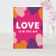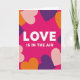 This Valentine’s Day card features the words “LOVE IS IN THE AIR” written in white, simple sans-serif letters near the top center. The background is a bold hot pink that instantly draws your eye and sets a bright, loving tone. Floating across the card are many overlapping hearts in light pink, warm orange, and deep purple. Some hearts extend beyond the edges, making it feel like the pattern continues all around. The heart shapes are smooth with clear outlines, giving the design a crisp, upbeat look. The mix of colors feels cheerful and romantic without overwhelming the message. It’s a sweet way to remind someone special how much they mean to you. Share it with a heartfelt note and send a little extra love this Valentine’s Day 💕❤️.