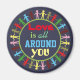 Circle of people holding hands with slogan "Love is all around you" on magnet. (changeable background color)