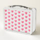 This is a standard metal lunchbox that appears to work just fine. We designed this box ourselves with an uploaded photo and custom text on the front and back. It looks absolutely beautiful except the front of the lunchbox is not centered like it shows in the photo. The print borders don't align with the inset flat part of the box where the preview photo online showed it perfectly centered in there. The back looks nice and centered though.