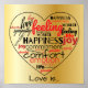 Heart shaped word cloud personalized poster design featuring repeating words in different fonts in red and black on a gold background. The text LOVE IS... is customizable.