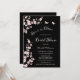 This elegant blush pink and black bridal shower invitation showcases the saying 'Love is in bloom,' adorned with beautiful blush pink cherry blossoms and two butterflies on a black background. The backside includes a QR code for the person of honor's gift registry.