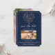 Photo Save the Date Announcement in Navy with Rose Gold Script Typography Glitter Heart. Elegant, Dark navy blue background with calligraphy script hand lettered typography artwork by Audrey Jeanne. That lettering was then transformed into rose gold glitter in a three dimensional look and surrounded by pink scrollwork swirls in the shape of a heart. The reverse side is second, full-size 5 x 7 framable photo that will be a keepsake gift to family and friends.. All artwork was created by internationally licensed artist and designer, Audrey Jeanne Roberts, copyright.