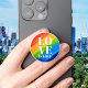 This colorful PopSocket is decorated with LOVE IS LOVE in bold white typography on a watercolor rainbow background of red, orange, yellow, green, blue, and purple.