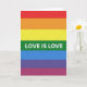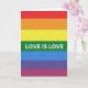 This card features the classic six-stripe Rainbow Flag filling the entire front, with red at the top flowing into orange, yellow, green, blue, and violet at the bottom 🌈. Across the middle, the phrase “LOVE IS LOVE” sits centered over the green and blue bands in bright white, using a simple sans-serif style that reads clearly at a glance. The horizontal stripes feel like a steady backdrop for two people standing close, as if their hands are just out of frame and their shoulders are gently touching. The warm red and orange at the top suggest an easy closeness, while the cooler blue and violet below add a calm, steady kind of support. There’s no extra scenery, so the colors and the message do all the talking, like a quiet nod between friends who understand each other 💚. The words are placed straight across the center line, with even spacing that keeps the focus on the message rather than decoration. Faint diagonal watermark lines can be seen lightly crossing the stripes when you look closely.