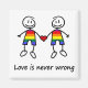 Love is never wrong t-shirts and gifts - gay pride design with two people in rainbow colors holding a red heart.