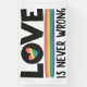 LGBTQ pride month banner featuring the caption "love is never wrong" in black all caps fonts decorated with a little rainbow heart and a colorful stripe on a white background.