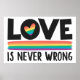 LGBTQ pride month poster featuring the caption "love is never wrong" in black all caps fonts decorated with a little rainbow heart and a colorful stripe on a white background.