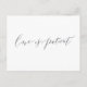 Modern wedding postponement postcards feature "Love is patient" calligraphy in charcoal black and white, simple and elegant, inform your wedding guests the updated information with this announcement.