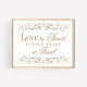 Decorative swirls and flourishes frame this elegant vintage inspired "Love is Sweet, please enjoy a Treat" dessert table sign. White and antique gold design colors.