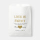 A custom favor bag reading "Love is sweet. Thank you for sharing our special day." Personalized with the bride and groom's names written over a heart, and the wedding date. Perfect for favors, candy buffets, and more!