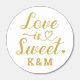 A luminous wedding kiss favor showcasing a custom "Love is Sweet" label in warm gold calligraphy script with a heart accent and the couple's initials on a clean white background. Rich gold tones on white create a classic, refined look with timeless appeal. Customize the initials for a beautiful reception or candy bar treat. All text is fully editable.